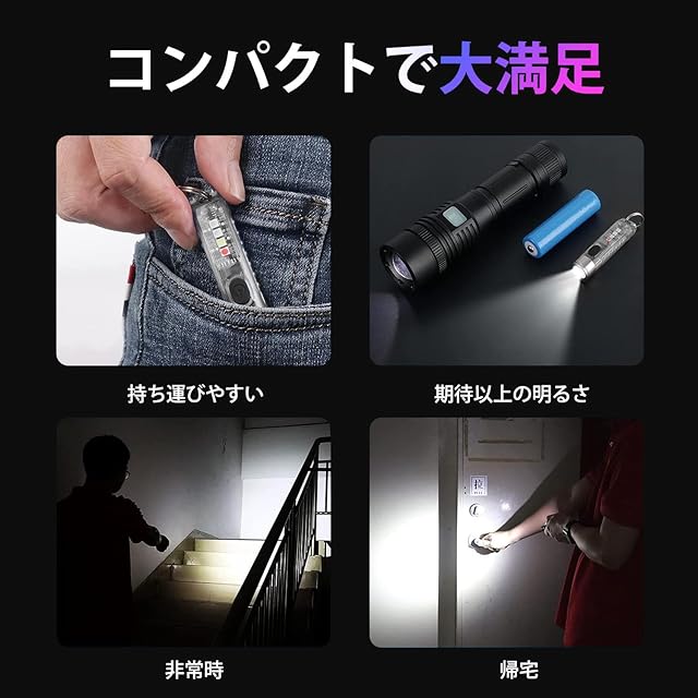【高輝度&USB充電式】: 高輝度のXPG2*2個のLED電球を採用しており、小さいながら十分に明るい光を発します。鍵や衣服にぶら下げられる小ささで、直視厳禁の明るさ(MAX)900ルーメン)! 高品質の500mAh充電式リチウム電池を内蔵しており、約2.5時間の満充電で、2時間の連続点灯ができます。電池交換の悩みを解決して、お金と時間を節約できます。 また、充電ポートには防水ゴムプラグを採用され、水蒸気の侵入を効果的に防止し、小雨、地震、停電など万が一の時に防災用品として便利です。