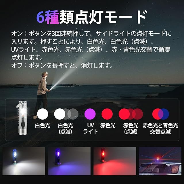 【10種類点灯モード&幅広い用途】: 10種類点灯モードがあり、メインランプは5つの明るさモードがあります(超強光-強光-ミッド光-弱光-エコライト)、側面の5つのモードを備えます(白の光、紫の光、赤信号、赤く点滅、赤と青交替点滅)。 紫の光モードは跡の識別、隠れた危険虫を現す、偽札を鑑定、蛍光剤、増白剤等の残留確認ことに役立ち、赤点滅モードがSOS救助信号として使え、日常は懐中電灯として使用します。