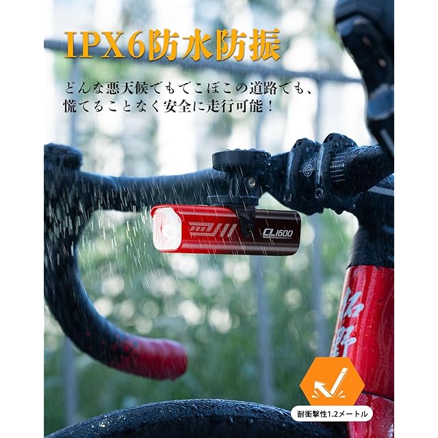 5000mAh大容量と高輝度フロントライト:アルミ合金製で大容量5000mAhのバッテリーを搭載しており、最大12時間(フラッシュ)連続で長時間ご利用いただけます。CL1600 ロードバイク ライトは防眩レンズを備えており、上の配光をカットして、走行中に対向車が眩しくなくて人の安全性も向上させます。最大出力1600ルーメンで、照射距離は最大約180メートルまで達します