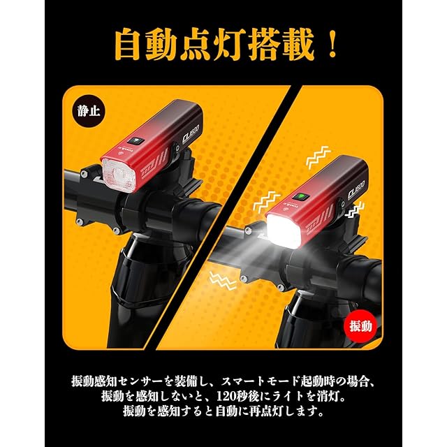 ロードバイクライト 自動点灯と吊り下げ可能:CL1600自転車用ライトは振動感知センサーが付きまして(スマートモード起動の場合)、振動を感知しない時に自動消灯、また振動を感知したら自転車 ライトは自動で点灯します。記憶機能も付きまして、直前のモードは記憶されています。付属する六角レンチでサイクル ライト本体のブラケットを取り外して方向を転換するとハンドルバー上下にも取付可能です。