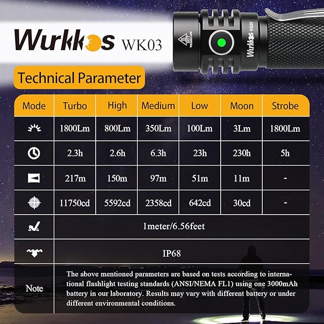 Wurkkos WK03 懐中電灯 防災 ledライト 1800ルーメン高輝度 フラッシュライト 小型 IP68防水機能 充電式 電池残量表示 停電 緊急用 夜釣り修理作業(6500K)