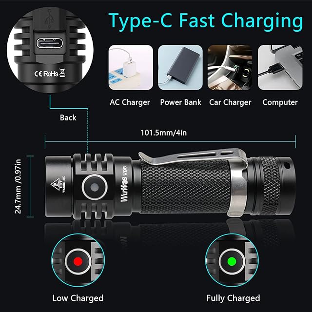 【強力懐中電灯】 WK03は高輝度のミニ懐中電灯です。 この充電式ライトは6段階の明るさがあり、日常的な照明に適したレベルは中段階の明るさで、最も明るいレベルは1800ルーメンで、夜間に潜在的な危険に遭遇した際、非常に明るい光で危険を指し示すことで、逃げる時間を稼ぐことができます。 このトーチにはTIR光学レンズが装着されており、最大217mの非常に明るい出力を生み出し、ソフトでバランスの取れた光束を作り出します。