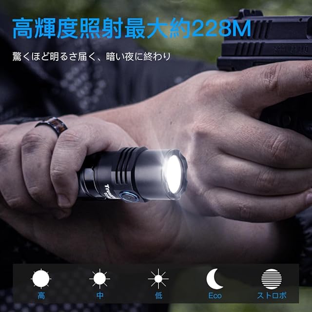 【超高輝度・5モード調光・操作簡単】弊社のT21R戦術懐中電灯は最大2600ルーメンの出力を備え、深夜にも大胆不敵です。軽量で片手で使える大きさ、手元にあるスイッチは電源オン・オフ、モードの変更も片手で操作できます。フラッシュライトのテールボタンを押すと、懐中電灯をオン/オフにすることができます。オンの状態でサイドボタンを押すだけで5つの照明モード調節可能です、デイリーモード:省エネ、低輝度、中輝度、高輝度;非常灯モード:フラッシュ/SOS点滅。様々な暗い環境にも対応しやすく、懐中電灯の最も遠い照射距離:約228m。※使用中は人の目に向けて点灯させない。