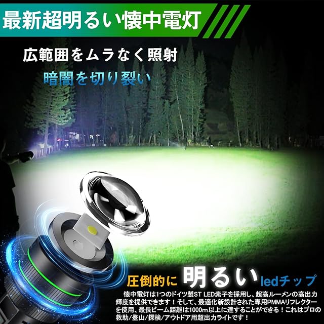 【新型超高輝度と遠距離&実用的なled輝度】この明るいLED懐中電灯は一つ高性能の LEDを採用し、明る高出力を提供できます!そして、最適化新設計された用PMMA大リフレクターを使用、懐中電灯は非常に優れた集光機能を備えて、照射距離最大9900メートルに達します。暗闇でも広範囲を明るく照らし出すことができます。狩猟、サバイバル、災害対策、仕事、旅行、捜索などの場合にも大活躍ですア。