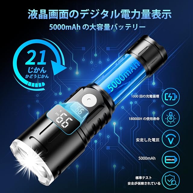 【大液晶画面デジタル残量表示機能&2つUSBのポート&Type-C急速充電】PSE認証済5000mAh大容量26650充電電池1本付属し、最大(SOS)35時間持続使用可能です。 懐中電灯は定電流回路を採用、温度センサーと保護回路を備えています。USB充電ケーブルを 懐中電灯の充電ポートに接続し、5V/2A(5V/1A)で充電した場合、約3(5)時間でフル充電ができます(利用可能時間表示)。 懐中電灯は2つのポート(USB充電ポートとUSB-A出力ポート)があり、緊急時に充電バッテリーとして使えることもできます。懐中電灯の電池残量は液晶画面に表示され、通常の残量ランプ式や数字%とは違って、電池残量は残り利用可能時間が表示されます。モードによって利用可能時間は異なり、パッと見ればどれぐらい使えるかが一目瞭然、走行中に突然バッテリー切れの心配がなく、充電するタイミングもよりはっきりと把握しやすい(できるだけ早く充電してください)の使用遅延を避ける。