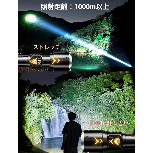 【6つの実用的な照明モード&記憶機能&長押し2秒で自動消灯 & 長寿命】高性能LED充電式懐中電灯は4種類の照明モード(省エネ/低/中/高)と隠し2つのシンチレーションモード(ストロボ/SOS)があります。用途に合わせて6段階の点灯モードを切り替える事が出来ます。懐中電灯ライトの操作は非常に簡単で、電源ボタンを押すだけで、省エネ、低輝度、中輝度、高輝度モードを調節可能です。ボタンを連続2回押してシンチレーションに入ります(ストロボ/SOS)。記憶機能:ライトをOFFすると、次回で点灯する時は、元の明るさに戻ります。(ストロボ/SOSモードは記憶できません)。また、必要に応じて、この高輝度懐中電灯のヘッドを伸縮させて焦点距離を調整したり、長距離照明や大面積照明を自由に選択したりできます。 アップグレード版スイッチの設計は従来の消灯不便を回避したので、任意モードスイッチを長押すだけで、すばやく照明をオフにできます。高輝度懐中電灯、寿命200000時間。夜間照明、犬の散歩、ハイキング、釣り、停電、地震、災害緊急対策などの緊急時の使用に非常に適しています。