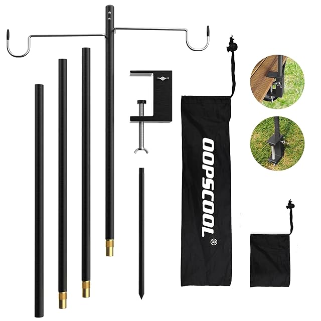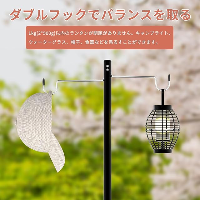 【高さ調整可能&ダブルフック設計】ランタンポール長さは4段階調節可能で、約32cm・65cm・93cm・125cm。机上なら低めに設置したり必要に応じて調節できます。「注意」:ランタンフック2個付き、耐荷重は約1kg(2*500g)。重さによってポールがしなる場合にはランタンハンガーの長さを短めに調節してみてください。 ペグ使用時は地面にしっかりと固定されているかご確認ください。