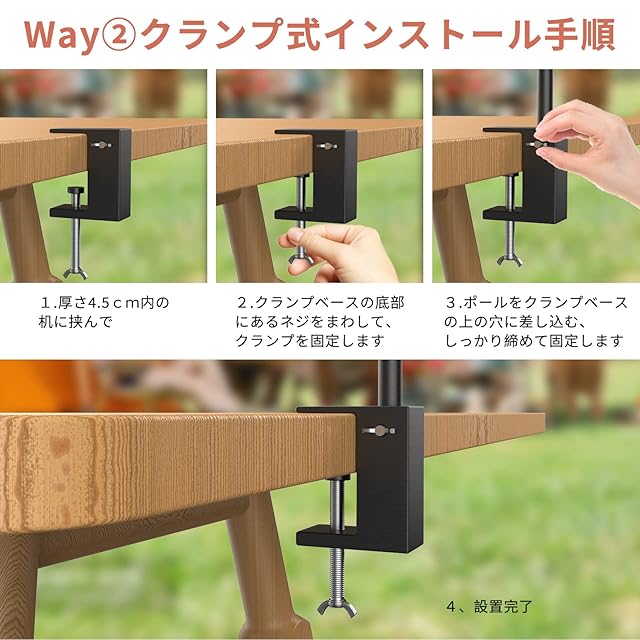 【2WAY ペッグ&卓上式-組み立て簡単】ランタンスタンドは地面にも挿せ、卓上にも着用可能。ペグで地面に打ち込みを選べば、好きな所に設置が可能です。付属のクランプでテーブル(厚み4.5cm内)の端に設置すれば、スペースを節約できます。高い位置から360度の灯りが得られ、美しい雰囲気を作り出します。