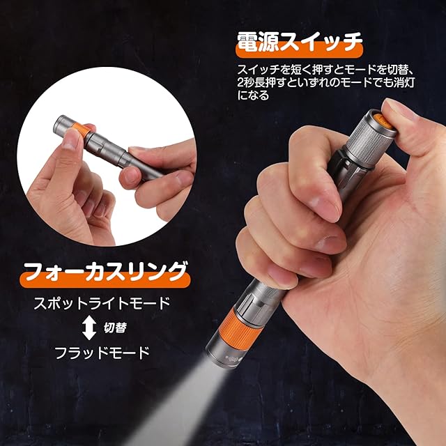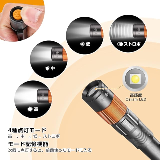 【4段階調光】高 、中 、低 、ストロボという4つ点灯モードが備え、電源スイッチをを短く押すとモードを切替、2秒長押すといずれのモードでも消灯になる。ズーム機能搭載:フォーカスリングを回転したら、ワイドライトとスポットライトが切替ます。