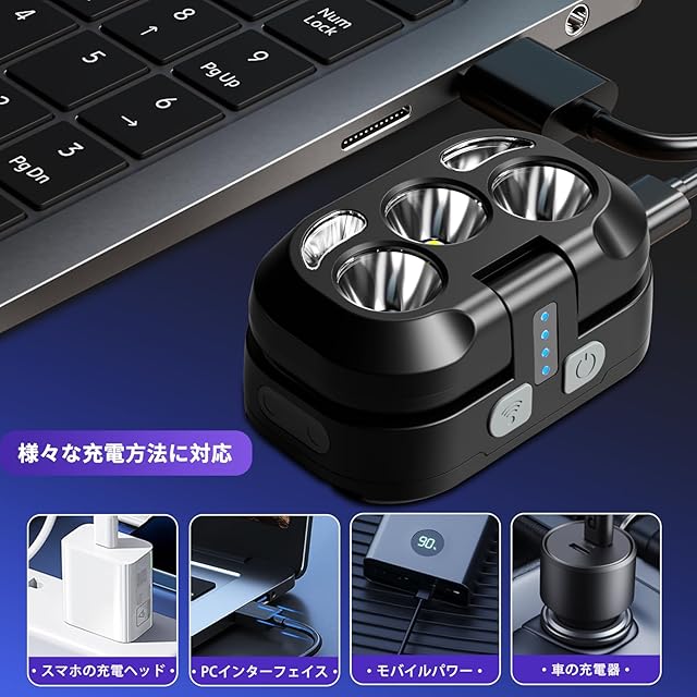 【クリエイティブヘッドライト】300~500メートルの印象的な照明範囲を提供する最先端ヘッドライトで、周囲の環境をはっきりと見ることができます。コンパクトでポータブルなデザインには便利なセンサーモードが搭載されており、ハンズフリー操作を実現することができます。デバイスがオフの場合は、ヘッドランプを反転するだけで読書灯をアクティブにします
