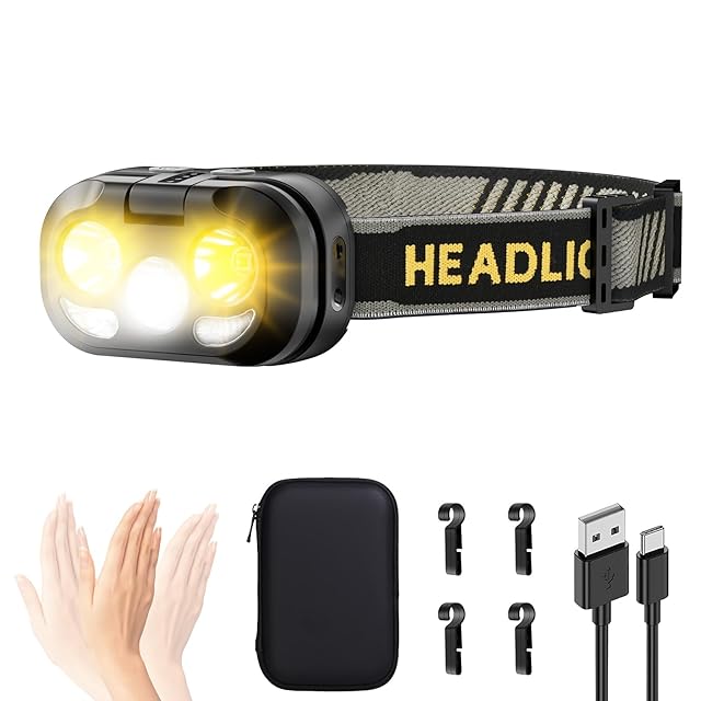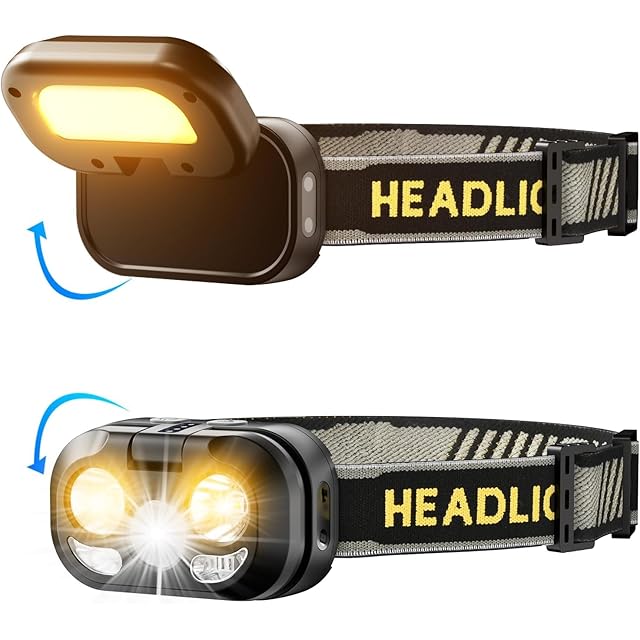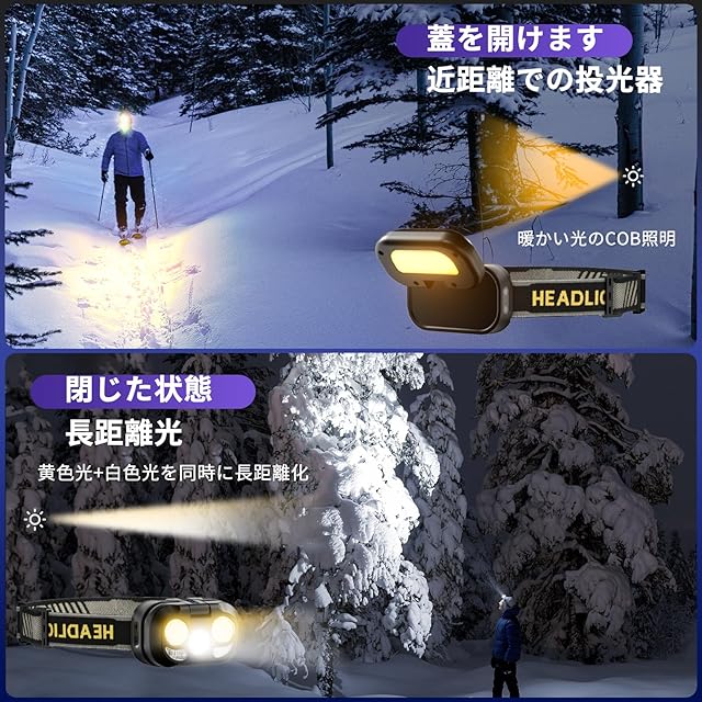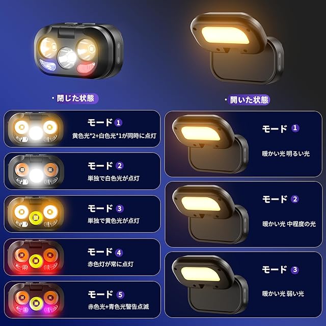 【多種照明モード】LEDヘッドランプは2つのモードボタンを備え、合計8種類の異なる照明モードを制御することができる。その中には、主なライトモードが含まれています。全輝度、冷光、暖光、赤光、赤青点滅。また、ナイトライトモード:高、中、低。スイッチを押すだけで、各照明オプションは10秒後に直接オフになり、柔軟で効率的に使用できます。