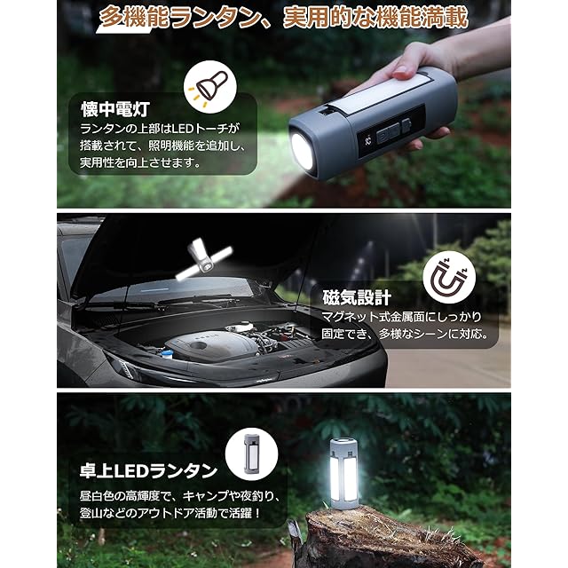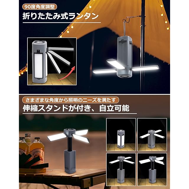【1台4役のLEDランタン】吊り下げ可能、磁気設計、手持ちなど多機能を備えた伸縮可能ななキャンプランタン登場!①ledランタン:側面3つのライトパネルを展開すると天井照明のようになり、キャンプサイト全体や大きな部屋でも、このランタン一つで十分な明るさを提供できます。②led作業灯:ランタンの底部には強力なマグネットが搭載されており、鉄製品にしっかりとくっつくので、夜間作業・自動車整備などでも役立ちます。③懐中電灯:先端にはスポットLEDを搭載し、暗い隙間や遠くを照らすのに好適です。④卓上ランタン:この自立式ランタンは伸縮可能なデザインで、LEDパネルが300°調節可能で、様々な場所に対応できます。