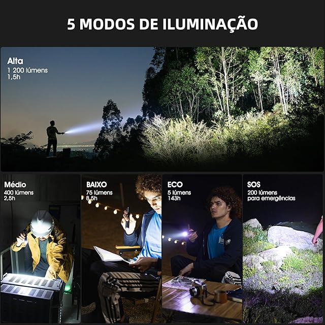 【5つのモード/多機能】4つの普通モード:強 1200LM / 中 400LM / 弱 75LM / 省エネ 5LM、メモリー機能も付きます。まだ、一つの隠しモード:SOSモード(L50 懐中電灯が起動の時に、スイッチを2回タップ)。多機能:L50 ハンディライトが起動状態の時、電池残り30分提示を検出する場合、ライトが5分ごとに3回を点滅します。