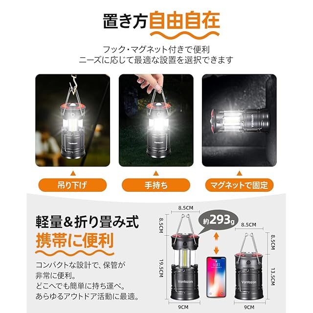 【360°全方位照明・3WAY設置対応】360°全方位発光LEDにより、テント内や広範囲の照明を簡単に行える キャンプランタン 。吊り下げ、手持ち、マグネット固定 の 3WAY設置 が可能で、 アウトドア はもちろん、車中泊やガレージ作業、災害時の 非常用ライト としても大活躍します。 軽量 & 折り畳み式 なので、バックパックや車のトランクにも コンパクト に収まる キャンプ ledランタン 。