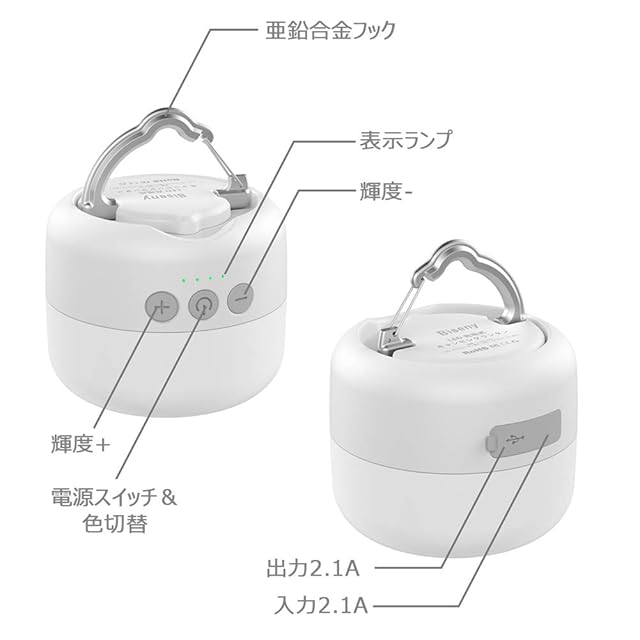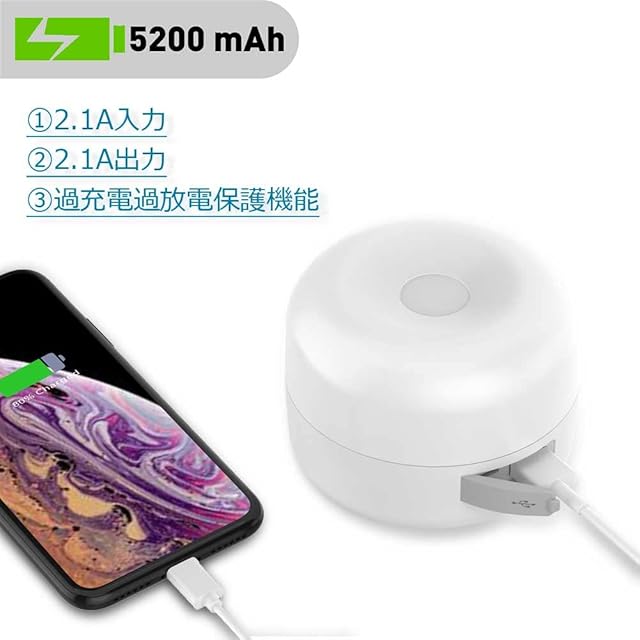 【5200mAh大容量、過充電・過放電防止機能搭載】:USB充電式の5200mAh大容量で、満電状態では(弱輝度で)255時間まで連続点灯可能です。本体側は入力端子を経由してランタンへ充電可能です(充電はAC 2A出力のアダプターを使用してください。それと、充電ケーブルが完全に差し込んだことをあらためて確認してください)。2.1A出力USB端子でスマホやタブレット、GPSなどへ充電可能です(応急電源として利用可能)