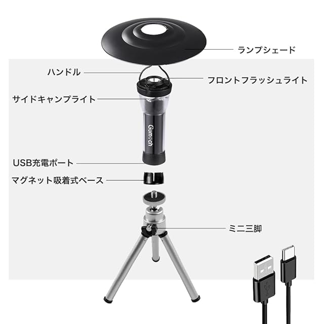 【製品仕様】カラー:ブラック、サイズ:Φ3.8cmX9.8cm、重量:75g、素材:PC+ABS、バッテリー容量:3.7V 2600mAh、NMC内蔵リチウム電池、定格出力:5W、充電方法:USB Type-C充電ケーブル、点灯時間:約7~120時間、防水等級:IPX4 生活防水等級(ハウジングが濡れても大丈夫です。)。 付属品:ライト本体×1、マグネットスタンド×1 、ミニ三脚×1、シェード×1 、USB Type-C充電ケーブル×1、日本語説明書×1
