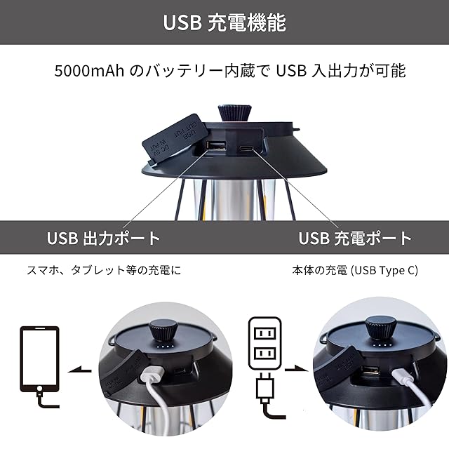 【USB充電・出力機能】5000mAhのリチウムイオンバッテリーを内蔵し、付属品のUSB Type C ケーブルにて本体を充電することで、繰り返し使用することが可能です。また、スマホ等を充電するUSB出力機能も備えております。