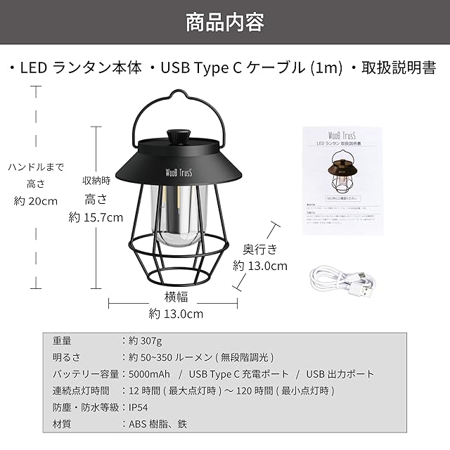 商品名:WoodTruss LEDランタン [無段階調光, 調色, USBTyepC充電, 5000mAh , 防塵防水:IP54, キャンプ] ブラック