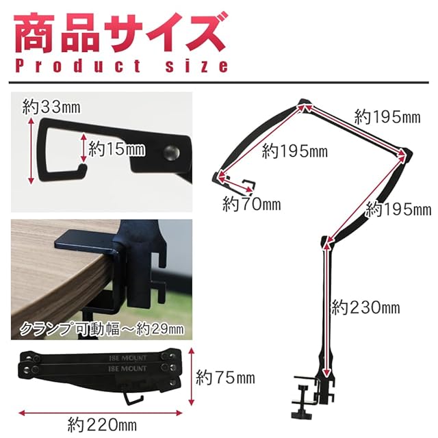 本体は耐久性に優れた素材を使用しているので、変形や劣化しにくく長い間ご愛用いただけます。テーブルの天板を挟むクランプタイプのため、工具不要で誰でも気軽に設置できるところがポイントです。※厚さ29mm以内の天板に対応しています。