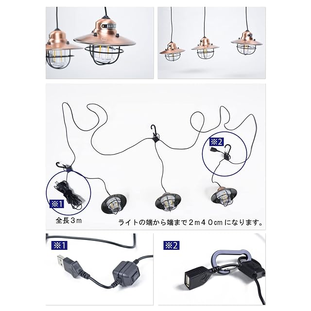 Barebones Living ベアボーンズリビング エジソンストリングライトLEDはエジソンタイプのLEDを採用し、 ベアボーンズリビング製バッテリーやその他のUSB-ACアダプターやUSBバッテリーなどのUSB電源で使用が可能なペンダントライトが3つ繋がったライトです。ハイ、ローモードの光量の選択が可能です。 ※連続使用時間はベアボーンズリビングポータブルチャージャー【4400mAh 2.4A】を使用した場合の数値となります。 ※本製品にはUSB電源は付属されません。 ※エジソンストリングライトは2つまで連携可能です。
