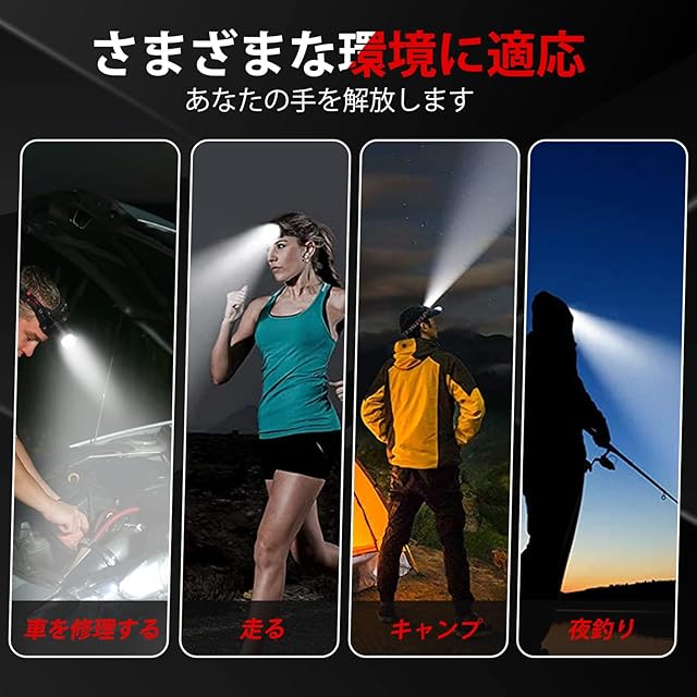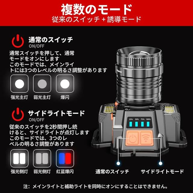【7モード&赤青点滅&スーパーブライト】充電式 ヘッドライトが新しくアップグレードされました!旧バージョンに比べ、サイドライトと赤青点滅機能が追加されました。さまざまな作業ニーズに対応するために、合計7つのモード(メインライト:グレア-低ストロボセンサーモード、サイドライト:グレア-低-赤と青の点滅)。最高のT8チップを使用すると、明るさは通常の芯の6倍、3000 lmで、最長のショットは1000フィートです。【7モード&赤青点滅&スーパーブライト】充電式 ヘッドライトが新しくアップグレードされました!旧バージョンに比べ、サイドライトと赤青点滅機能が追加されました。さまざまな作業ニーズに対応するために、合計7つのモード(メインライト:グレア-低ストロボセンサーモード、サイドライト:グレア-低-赤と青の点滅)。最高のT8チップを使用すると、明るさは通常の芯の6倍、3000 lmで、最長のショットは1000フィートです。