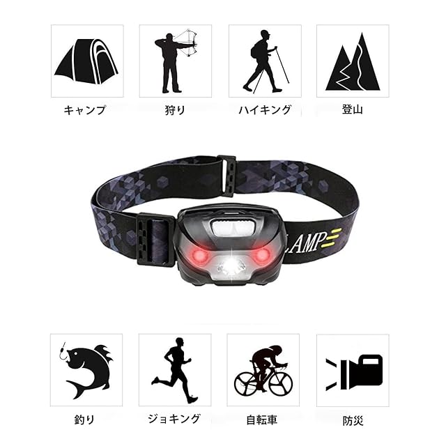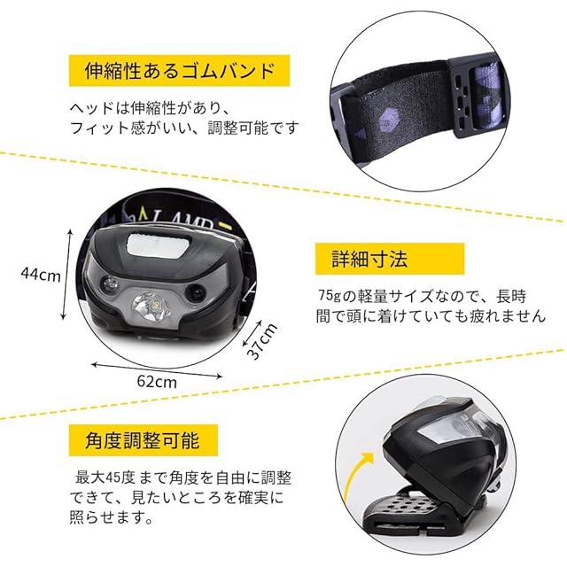 【角度調整可能&多機能】: 本ヘッドライトは角度調整機能が付いています。照明角度は最大45°まで調整可能。いろんな場面で使えます。例えば、車の修理、屋内の作業、アウトドアの散歩、ジョギング、キャンプ、釣り、狩猟、登山、サイクリングなどの夜の活動にお役に立ちます。