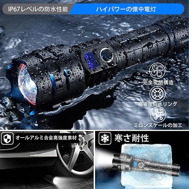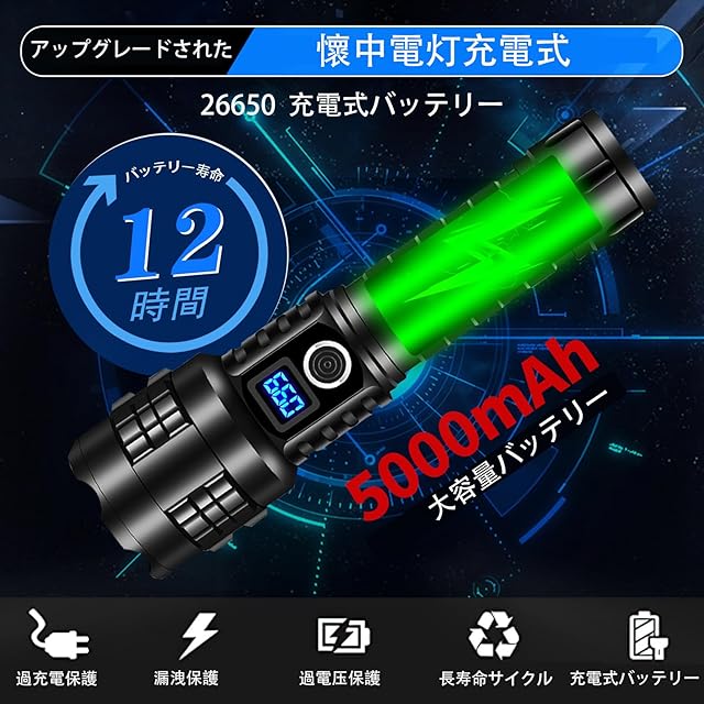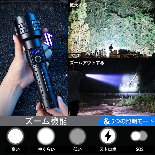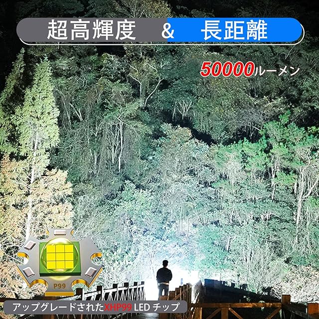 商品名:LED懐中電灯 強力 超高輝度 50000ルーメン フラッシュライト 充電式 懐中電灯 led 強力 軍用 最強 ハンディライト XHP99 超強力ライト 電池式 ハンドライト flashlight 明るい IP67防水 5モード調光 ズーム調整可能(5000mAh バッテリー 3 * AAA バッテリー付属)