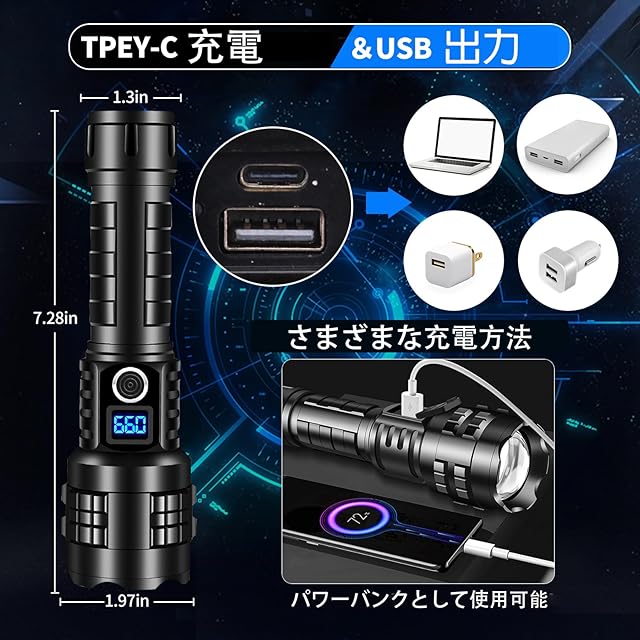【LCDパワーディスプレイ | 懐中電灯 充電式 | USB出力】この懐中電灯 強力は高ルーメンの充電式で新しくアップグレードされ、1回の充電で最大12時間使用でき、通常のLED懐中電灯よりも長持ちします。 ユニークなLCD電力表示により、一目で残量を把握できます。懐中電灯 led 強力 軍用 最強はUSB-Cケーブルで充電できるため、フラッシュライトをより便利に充電できます。