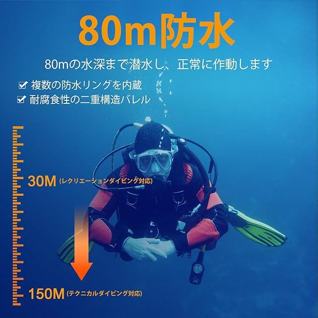 【ダイバーのために設計された完全防水仕様】高度なIPX-8防水規格により、完全に水没しても問題なく使用可能!ダイビング中の水圧や深海での使用においても絶対的な信頼性を誇り、ダイバー必須のアイテムです。スキューバダイビングとシュノーケリングダイバーに勧めのプロ仕様水中ライト。