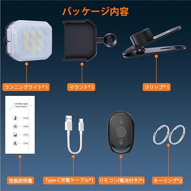 <b>★商品仕様</b><br> 商品名:汎用アウトドアクリップライト<br> 八つの発光色:ホワイト(2段階輝度)/赤/青/イエロー/アイスブルー/電球色/緑/ピンクパープル<br> 発光バルブ:9連5005SMD RGB+W 発光チップ<br> 照明モード選択:単色常時点灯、単色(白赤青黄)速い点滅、単色(白赤青黄)スロー点滅、赤と青の切替モード、7色サイクル速い点滅、7色サイクルスロー点滅、様々21種類の発光モード<br> バッテリー:500mAh<br> 充電時間:約2.5時間<br> 防水性能:IP6<br> サイズ(クリップ含み):約6.8センチ*3.4センチ*7センチ<br> サイズ(ランプ本体のみ):約4.1センチ*3.4センチ*2.1センチ<br> 重さ(クリップ含み):約38グラム<br> 重さ(ランプ本体のみ):約23グラム<br> バッケージ内容:ランニングライト*1、リモコン(電池付き)*1、Type-C充電ケーブル*1、クリップ*1、マウント*1、ナット*1、キーリング*2、取扱説明書*1<br> <br> <b>★コンパクトで軽量なクリップ式点滅ライト</b><br> カラフルなフラッシュは重さが49グラムとコンパクトなので、ランニング中でも抵抗を感じません。ランプ部背後のクリップはグリップ力が安定し、簡単に外れることがありません。必要に応じて、ショルダーバッグや襟元、ズボン、ペットの首ひもなどに挟んでおくことができます。レンズの集光原理を利用して、光源をより効果的に投射し、より均一な照明を出します。ledクリップ式散歩ランプは、夜間の照明効果を高め、夜間に移動する人の安全性を高めます。<br> <br> <b>★幅広い用途に対応した多色LEDクリップライト</b><br> 夜間のランニング、散歩、ウォーキング、サイクリング、釣り、犬の散歩、山登り、キャンプ、スノーボーダー、ヘルメットライトなど、さまざまな用途に対応しています。高輝度の多彩なストロボライトは、夜間に高い視認性をもたらし、夜間の安全性を大幅に向上させる優れたシグナルとなります。<br> <br> <b>★クリップライトの使用について</b><br> 1.照明モードによって作業時間が異なりますが、特に単色常時点灯モードの場合は作業時間が短い場合があります。ご了承ください。<br> 2.LEDクリップライトはリモコンで制御されていますので、使用しなくても約14日で電力が尽きてしまいます。長期間使用しない場合は、ライトの電源をオフにすることをお勧めします。<br> 3.節電のため、リモコンで約2時間以上消灯すると自動的にオフになり、リモコンを再起動するにはライトのボタンを押す必要があります。<br> 4.初めて使用する時は充電完了してから使用してください。<br> 5.輝度が高いため、長時間使用すると熱くなることがありますが、これは正常なことであり、使用には影響しません。<br> 6.マウントの取り付け、取り外しの際には多少の力が必要です。<br> 7.弊店はご注文日より1年品質ありますので、商品が問題ある場合ご連絡をお願いします。
