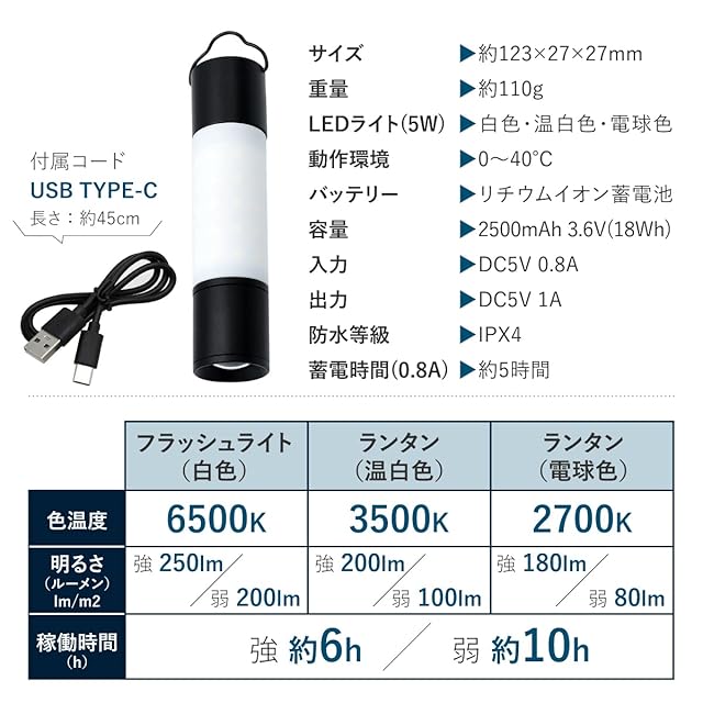【セット内容】ミニLEDライト×1点 USBタイプC充電ケーブル×1点 日本語説明書×1点 【サイズ(約)】ミニLEDライト:123mm×27mm×27mm USBタイプC充電ケーブル:47cm 【重量(約)】110g 【LEDライト】白色5W・温白色5W・電球色5W 【容量】2500mAh 3.6v(18Wh) 【入力】DC5V 0.8A 【出力】DC5V 1A 【防水等級】IPX4 【蓄電時間(約)】5時間