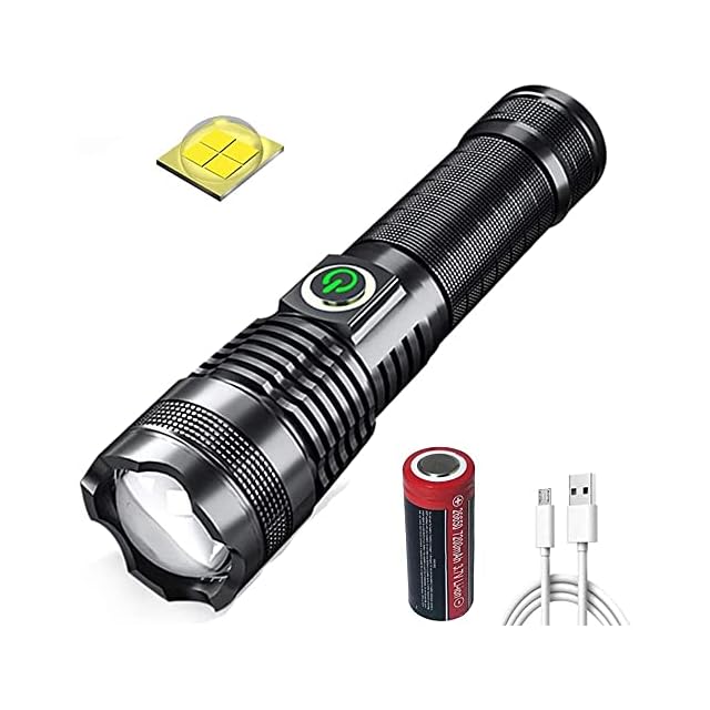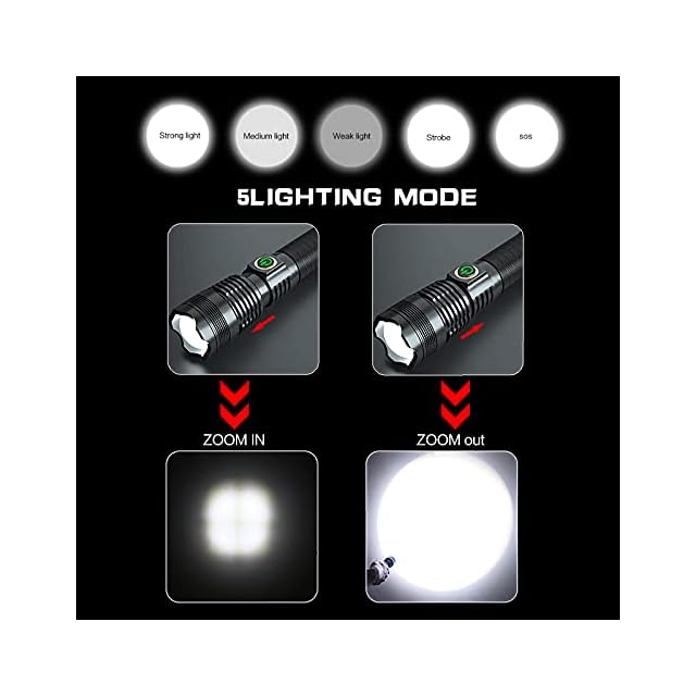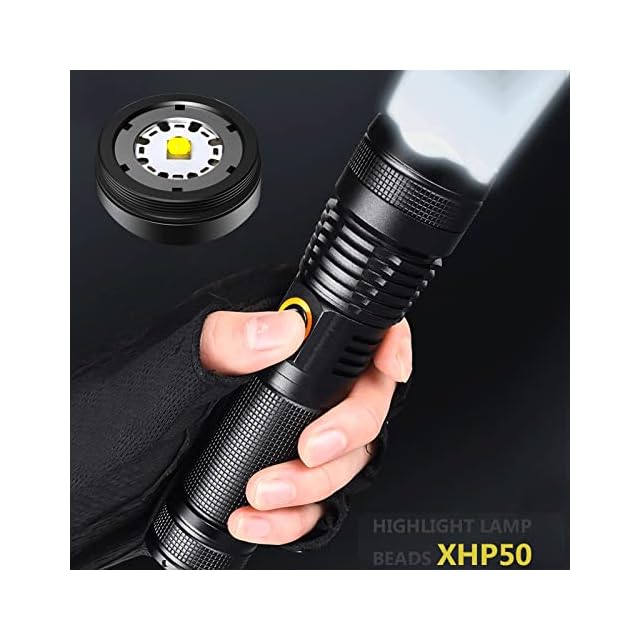 【超高輝度懐中電灯】CREEXHP70 LEDを搭載した最も強力な懐中電灯、最大出力8000ルーメン、CREE T6 LEDの6倍の明るさ。最大ビーム距離は最大500メートル(1640フィート)。寿命は最大50,000時間。注意:使用する前に完全に充電する必要があります。バッテリー「+」が内側を向いていることを確認してください。