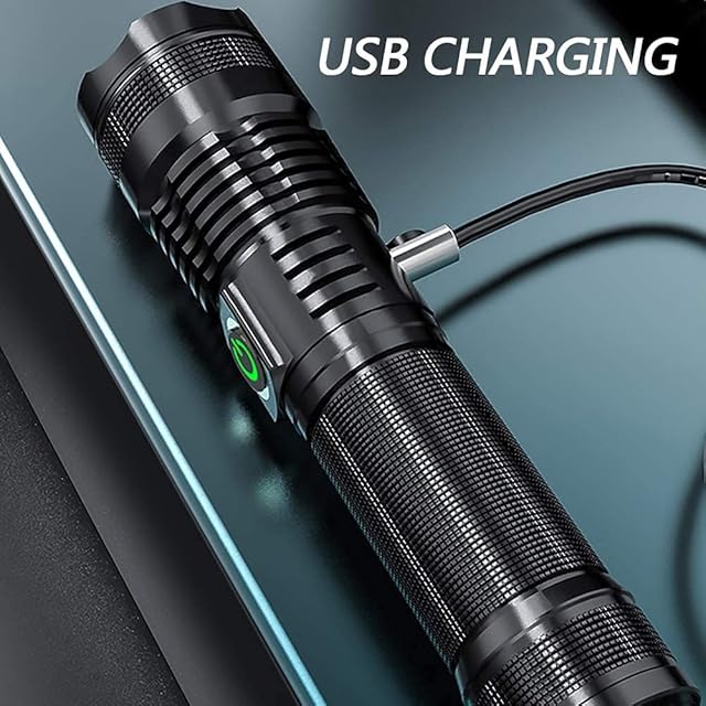 【USB充電式&電源ディスプレイ】USB充電式フラッシュライトは、コンピューターのUSB、車のUSB、USB充電プラグ、モバイル充電電源で使用できるUSB充電ラインをサポートしています。その循環充電は便利で環境に優しいです。懐中電灯の電源インジケータは、電池の状態を明確に理解するのに役立ちます。電池がいっぱいになると緑色になり、電池が少なくなると赤色になります。