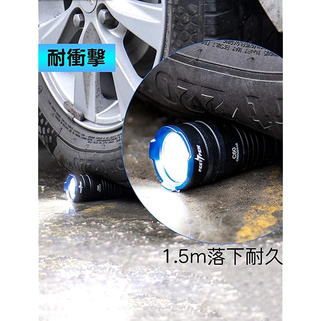 【耐水+耐久+耐衝撃形】あらゆる方向からの強い噴流水による有害な影響がないLED懐中電灯です。JIS(日本工業規格)認証されたIPX6耐水形、豪雨などの悪天気も安心して使用されます。軍用グレードの1.5m落下耐久性、約1.5メートルの高い場所より不注意で落下しても問題ありません。防水・耐塵・耐衝撃に優れた製品です。