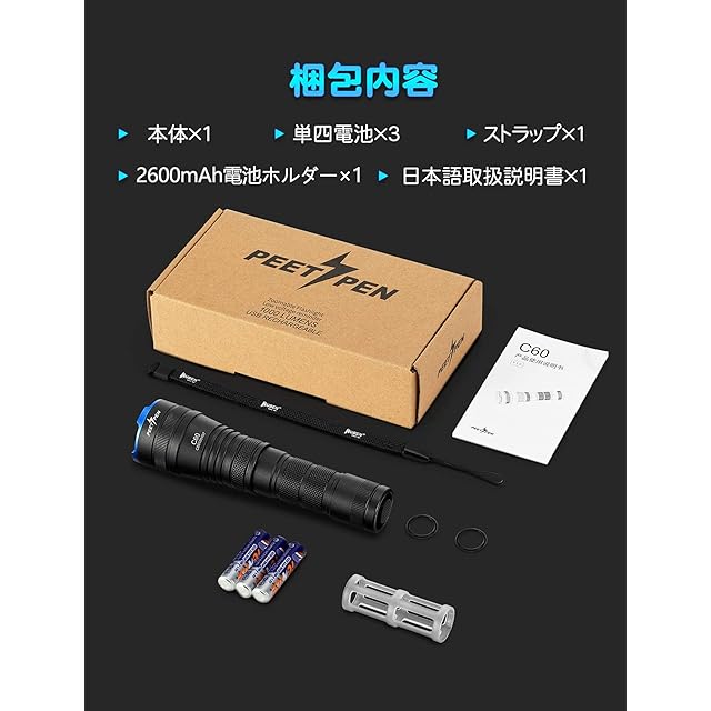 商品名:PEETPEN C60 懐中電灯 1000ルーメン led ズーム式ライト 戦術ライト 軍用 強力 警備 戦術点灯 高輝度 フラッシュライト 電池式 ズーム機能 明るい ハンディライト タクティカルライト IPX6防水 単四/2600mAh電池兼用 かいちゅうでんとう 3段階点灯+SOSモード ウォーキング/キャンプ/山登り/夜釣り モードメモリー 防災/停電対策