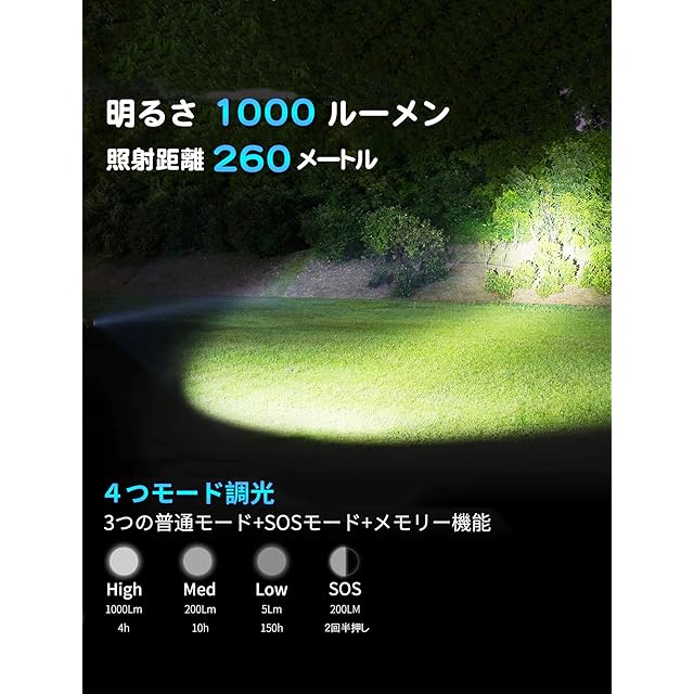 【ズーム機能+1000ルーメン(実測)+260m照射】ズーム機能を搭載している高輝度LED懐中電灯です。ヘッド部分を回して、スポットライトとワイトライト二つのモードを転換できます。ご使用する場所に応じて照らす範囲と照射距離を調節できます。明るさ最大1000ルーメン(実測値)、最長照射距離は260メートルとなります!
