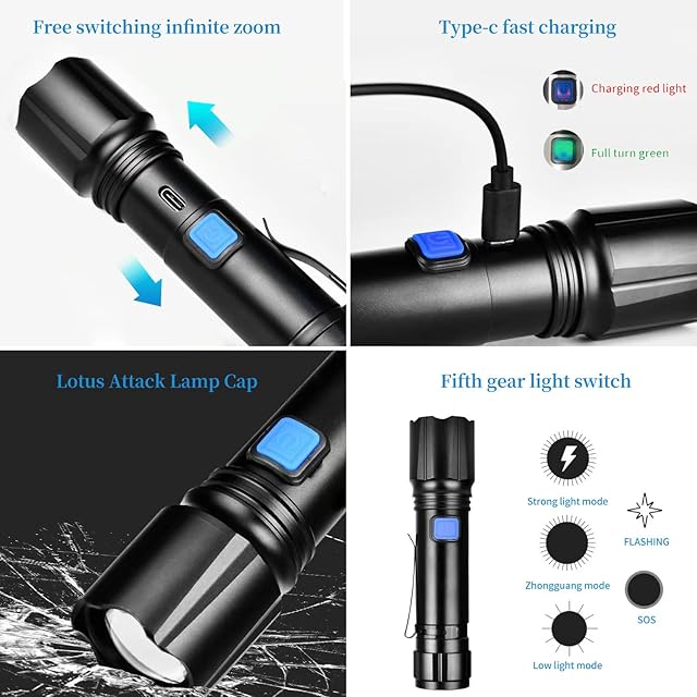 商品名:ミニ高ルーメン充電可能戦術懐中電灯、超明るい1000ルーメン懐中電灯 5つのモードでスケーリング可能な緊急キャンプ用Led懐中電灯。