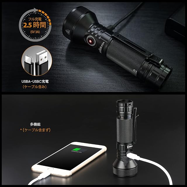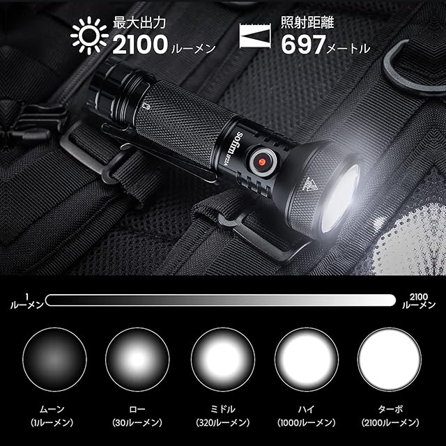 商品名:Sofirn 懐中電灯 LED USB充電式 フラッシュライト 強力 2100ルーメン SFT40 TIRレンズ 照射距離690メートル TypeC型 ハンディライト サーチライト 軽量 キャンプ 夜釣り アウトドア 無段階調光 ステップ調光 防災グッズ 電池付き