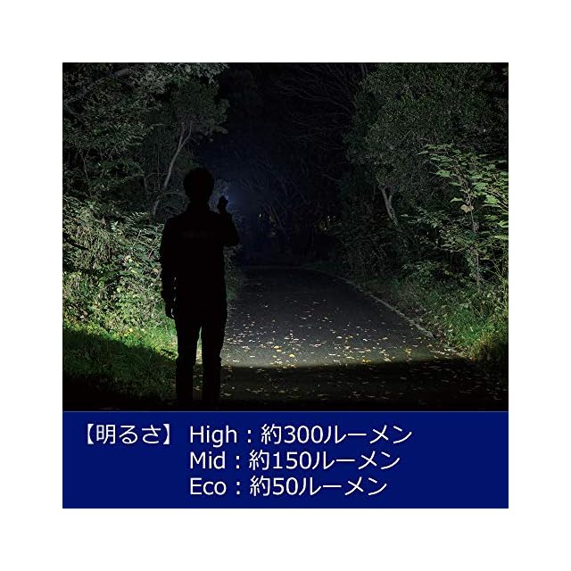 明るさ:High/300ルーメン、Mid/150ルーメン、Eco/50ルーメン
