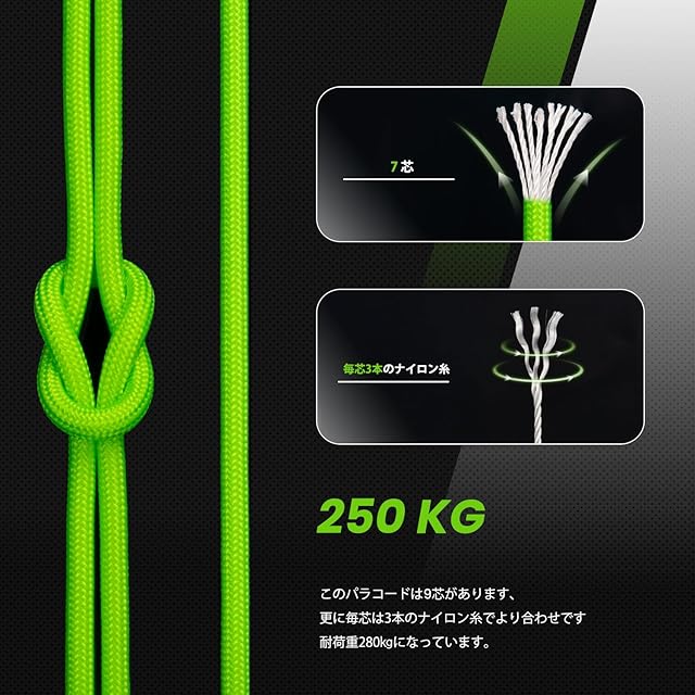 【利用場所】キャンプ、アウトドア、ハイキング、魚釣りの糸(中の糸を引き出して使用)、車の牽引、スニーカーの紐および様々な野外活動でご利用いただけます。吹雪や台風期間の荷物を固定などの場合は、数本をを束ねて利用してください。