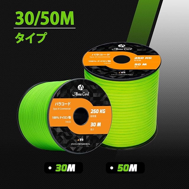【とご注意】お届けした商品に万一、汚損、破損等がある場合、弊社までご連絡願います。確認次第、早急に対応させていただきます。本商品はロッククライミング&プロ登山用ロープとして使用できません。緊急の時だけは、折り返して2~3本を束ねて利用してください。ただしこの場合もパラコードの本来の利用範囲以外なので、あくまで自分責任になります。予めご了承ください。