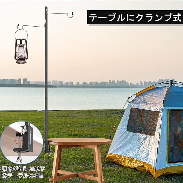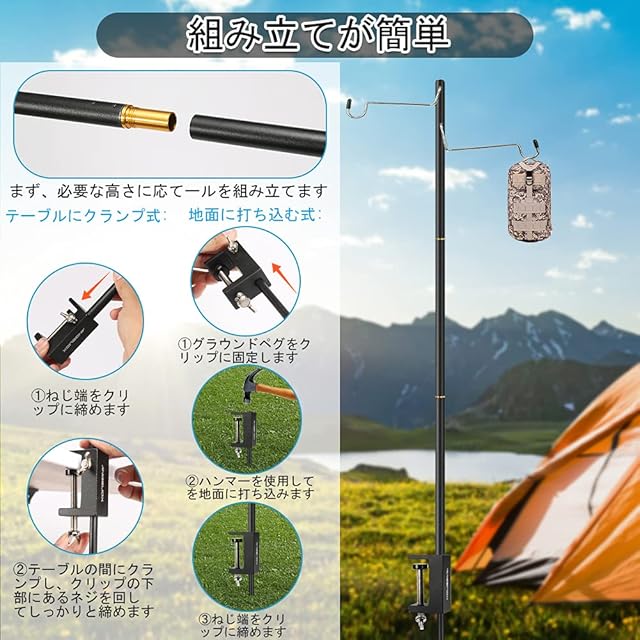 高品質な素材:ランタンスタンドのアルミ合金製のポールは直径は12mmまで、ポールの壁厚も1mmの厚さを採用されて、全体の耐荷重が大幅のアップとなります。固定クリップとグラウンドペグは高品質のスチール製であるため、ランタンポールをテーブルまたは地面にしっかりと固定で、揺れなく、安定となります。フックも高品質のステンレス製で、重いものを吊るしても変形しません。