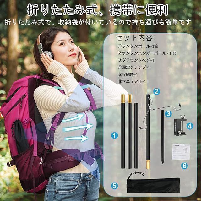 持ち運びやすい&組立簡単:ランタンスタンドの展開の高さは160cmですが、収納すると、各節35 cmしかないため、簡単にバッグに入られます。たった320Gと非常に軽量で、外出や持ち運びにとても便利です。ランタンハンガーは組み立て・分解が簡単です。ステンレスネジ接続を採用して、高さに合わせて組み立てることができます。