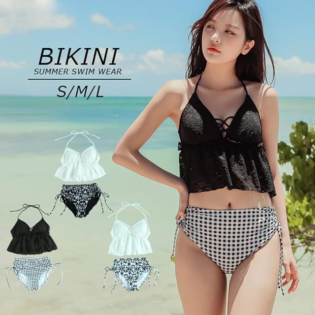 [アウニイ] 水着 レディース 体型カバー ビキニセット 可愛い水着 ママ水着 人気 レース素材 紐 トップス ハイウエスト パンツ セット 花柄 フリル バンドゥ ビキニ 上下 ショーパン おしゃれ タンクトップ 2022 夏 ボーダー セパレーツ 折りボーダー柄 女性水着 可愛い フラワー キャミキニ 高校 高校 1905-02 (Aタイプ L)