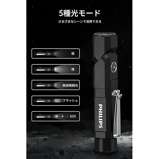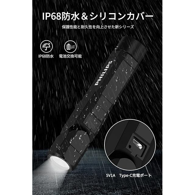 Philips(フィリップス) ledライト 小型 懐中電灯 強力 フラッシュライト 1000ルーメン 高輝度 Type-C充電式 首振り 作業灯【90°回転/18650電池交換可/クリップ付/マグネット/低電量提示】L字 L型 胸ライトSFL5806BK