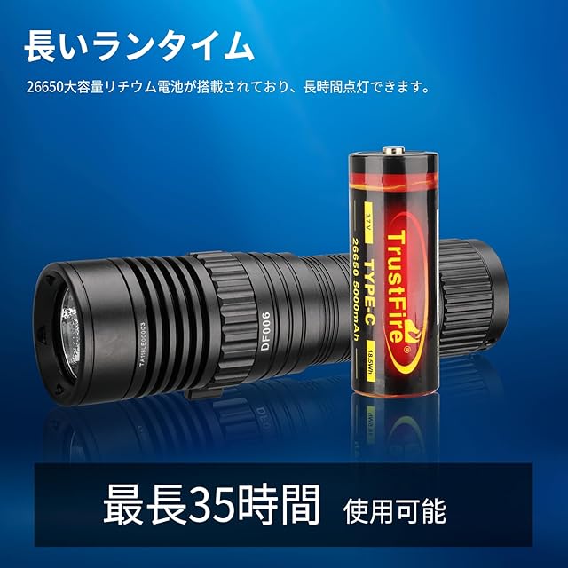✅マルチ充電方式・実用点灯最大35時間:1本5000mAh 26650充電式バッテリーとUSB-C充電ケーブルが付属し、電池にUSBポートがありますが、多種の充電方式があり、携帯電話の充電器の充電、モバイル電源の充電、自動車の充電、パソコンのUSBポートの充電ができる。災害避難じでも充電切れの心配なく長時間活用できます。LEDライトは3回点滅して電池容量低下による充電必要時をお知らせしたりできます。