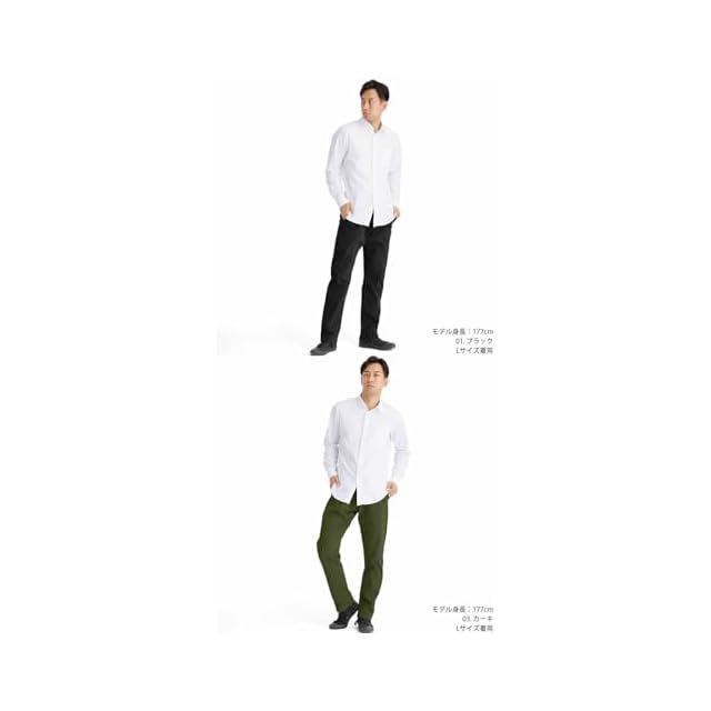 生地はコットン97%の厚みのあるしっかりとした質感で、肌触りもよく、 厚手で丈夫、ハリがあり耐久性に優れている。 安っぽい光沢感もなく、シワにもなりにくい。 また、腰から腿周りはゆとりがあって、 足首にかけて細くなる、テーパードシルエットなので締め付け感なく、快適な履き心地。 すっきり見えて、足が長く見える効果も。