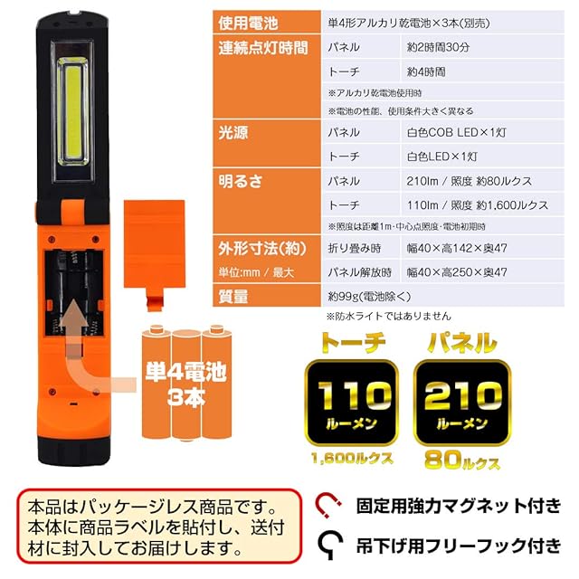 電池寿命:COB LEDパネル 2時間30分、LEDトーチ 4時間