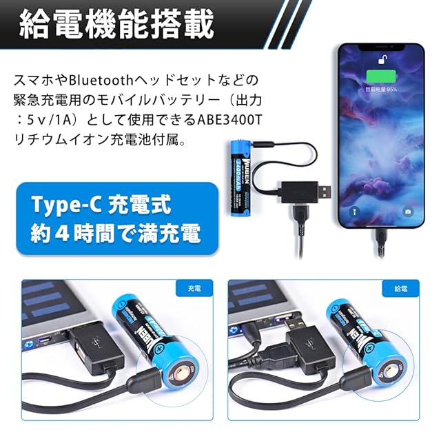 【Type-C充電式・給電機能搭載】給電機能搭載スマホやBluetoothヘッドセットなどの緊急充電用のモバイルバッテリーとして使用できるABE3400Tリチウムイオン電池付属。モバイルバッテリーとして使用可能。