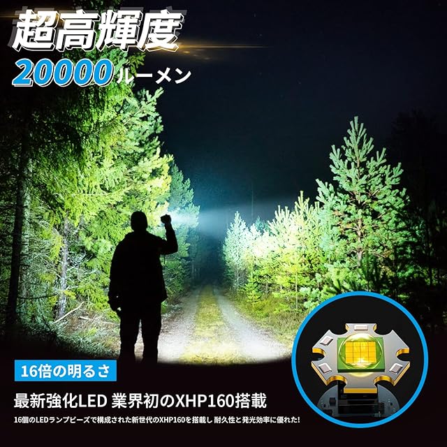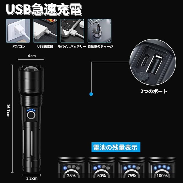 商品名:懐中電灯 LED 強力 フラッシュライト【超高輝度 XHP160】ハンディライト 付属USB夜の光 5000mAh大容量電池 野外活動 停電 防災 夜間訓練 作業用 5モード調光 ズーム式 Type-C USB充電式 放電可能 白&赤色灯 IPX6防水